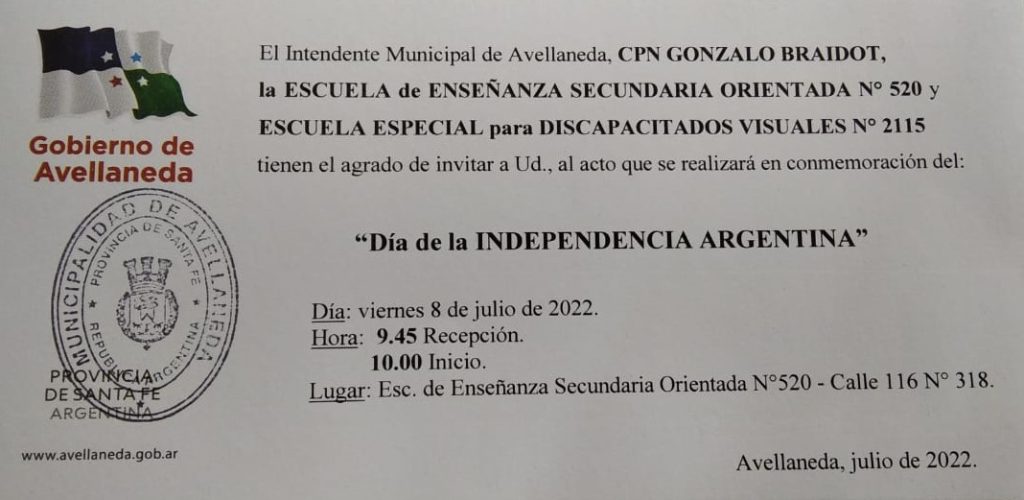El Gobierno de Avellaneda junto a la Escuela de Enseñanza secundaria orientada N° 520 y la Especial para discapacitados visuales N° 2115 invitan a la comunidad, a participar del Acto conmemorativo del Día de la Independencia de nuestro país.