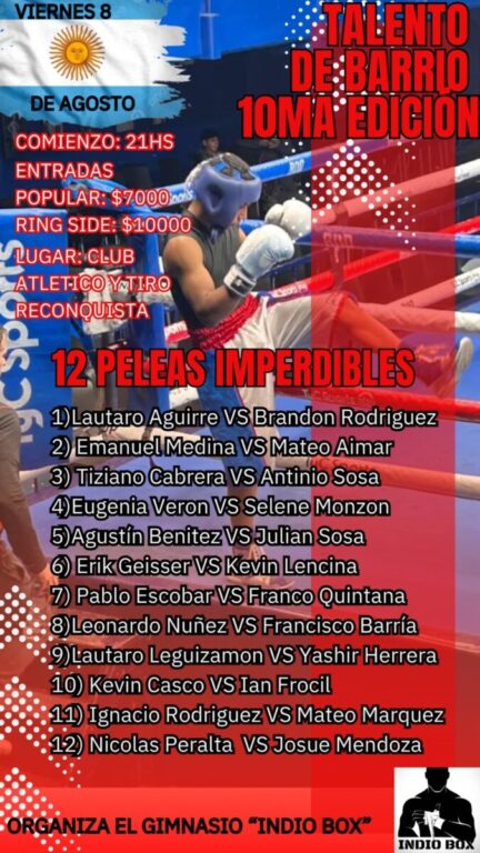 El rival de la promesa del Boxeo Argentino en la velada «Talento de barrio 10º edición» será Josué «Turbo» Mendoza (17 años), del Team Díaz Boxing de la ciudad de José C. Paz, partido del mismo nombre, en la provincia de Buenos Aires y estará en juego el Cinturón de Técnicos Unidos de la FAB.