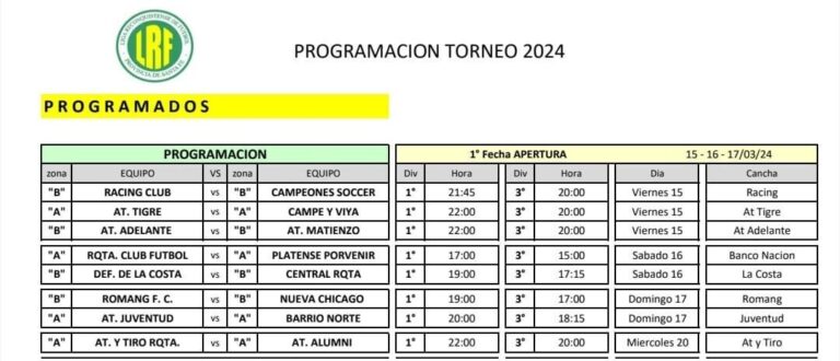 Entre el viernes 15, sábado 16 y domingo 17 de marzo se disputará la Primera fecha del torneo Apertura de la LRF. El miércoles 20/03 se completa, con el partido de Tiro (juega la Copa Federación) vs. Alumni.