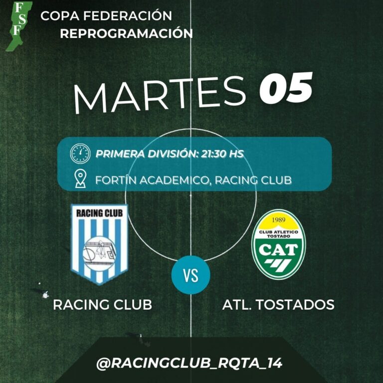 El equipo de Racing Club de Reconquista recibe al Club Atlético Tostado este martes 5 de marzo en el estadio «Humberto Savoia», mientras que Racing El Campesino de Villa Ocampo se medirá con Atlético y Tiro Reconquista mañana miércoles 6 de marzo.