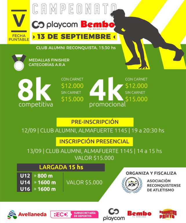 La competencia se cumplirá este próximo sábado 13 de septiembre con largada y llegada frente al edificio del Club Atlético Alumni de Reconquista (Almafuerte 1145).