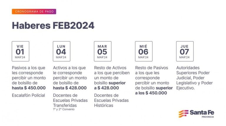 El Gobierno de la Provincia, a través del Ministerio de Economía, informó el cronograma de pago de los haberes del mes de febrero, que se percibirán a partir del viernes 1 y hasta el miércoles 6, en el caso de los agentes públicos; y se completará el jueves 7 para las autoridades superiores de los tres poderes.