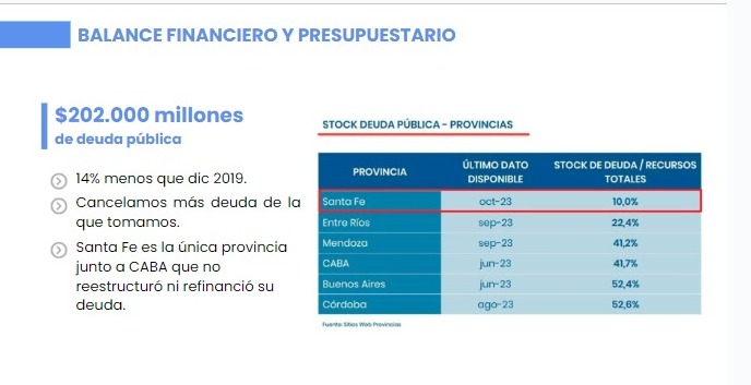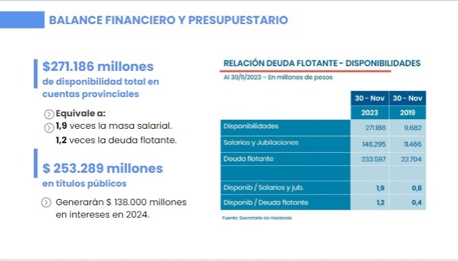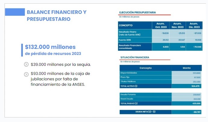 El balance financiero y presupuestario es de $271.186 millones de disponibilidad total en cuentas provinciales; $253.289 millones en títulos públicos; $202.000 millones de deuda pública; $132.000 millones de pérdida de recursos 2023 por sequía y falta de financiamiento de la Anses. Se otorgaron más de $32.700 millones correspondientes al Fondo para Municipios y Comunas.