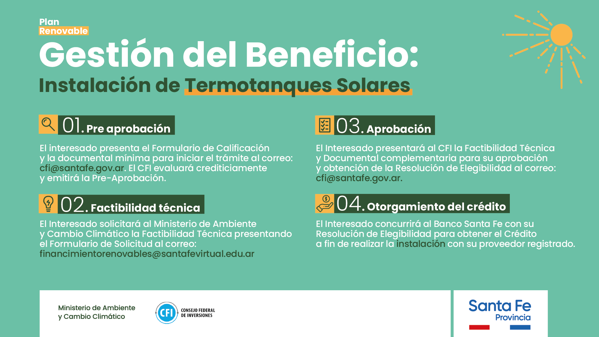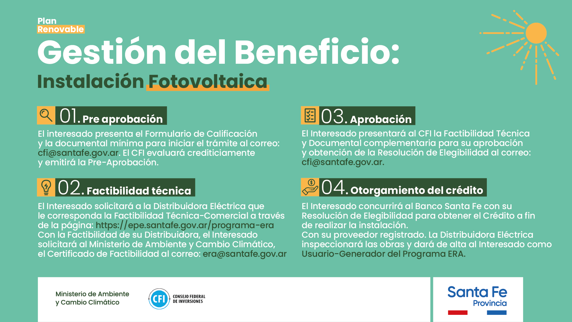 El programa, desarrollado por la cartera santafesina de Ambiente, implicará 400.000.000 pesos destinados a una serie de créditos para la compra e instalación de sistemas solares fotovoltaicos en el marco del Programa Energía Renovable para el Ambiente (ERA) y compra e instalación de termotanques solares. Los mismos están orientados a personas humanas, monotributistas y pymes y pueden inscribirse ingresando AQUÍ.