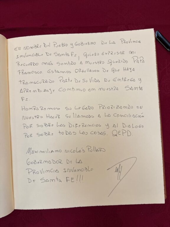 El gobernador de la Provincia, Maximiliano Pullaro, visitó este jueves la Nunciatura Apostólica -Embajada de la Santa Sede en Argentina-, en el barrio de Recoleta de la ciudad de Buenos Aires, donde redactó un sentido mensaje en el libro de adhesión dispuesto para honrar la memoria del Papa Francisco, en el marco de los siete días de Duelo Nacional decretado por su reciente fallecimiento.