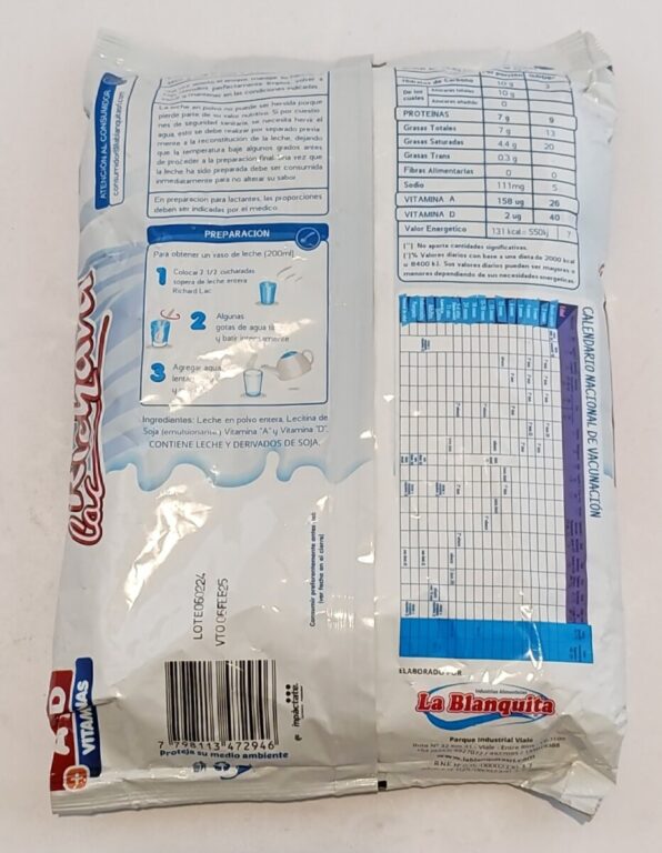 Denominación de venta: Leche en polvo entera instantánea fortificada con vitamina A y D.