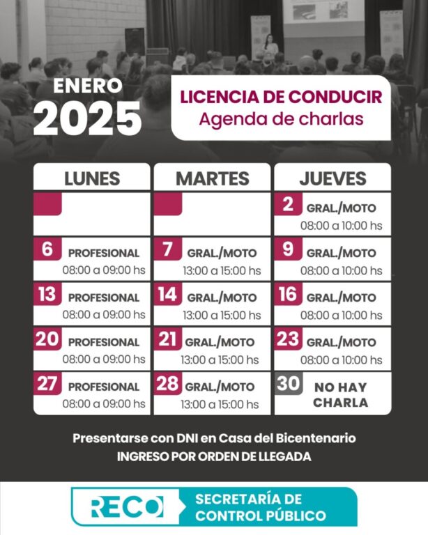 La Secretaría de Control Público de Reconquista informa el cronograma de charlas para tramitar la Licencia de Conducir durante enero de 2025. Las jornadas se realizarán en la Casa del Bicentenario, con ingreso por orden de llegada. Es obligatorio presentarse con DNI.