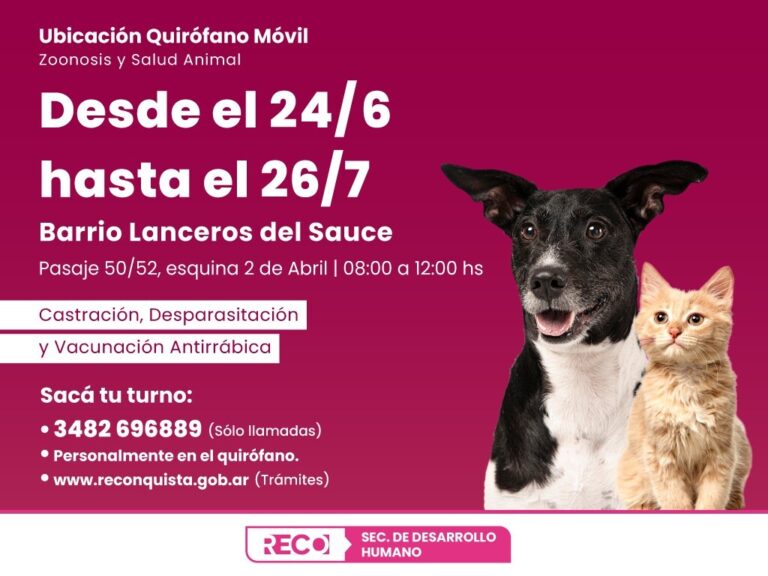 La Municipalidad de Reconquista informa que el Quirófano Móvil de Zoonosis y Salud Animal brinda sus servicios gratuitos en el CIC de Barrio Lanceros del Sauce, desde el lunes 24 de junio hasta el viernes 26 de julio inclusive. El horario de atención es de 08:00 a 12:00.