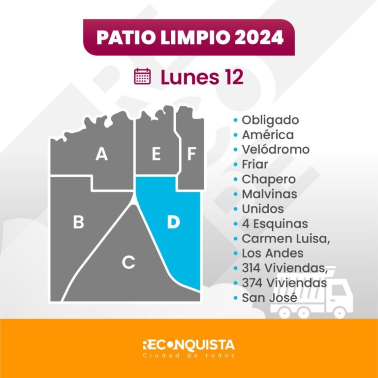 El programa Patio Limpio comienza sus tareas en la Zona D, que corresponde a los barrios Obligado, América, Velódromo, Friar, Chapero, Malvinas, Unidos, 4 Esquinas, Carmen Luisa, Los Andes, 314 Viviendas, 374 Viviendas y San José. Cabe señalar que la semana pasada, como adelanto de las tareas programadas para el inicio de la zona D y atendiendo a que sería una semana de solo 3 días hábiles, se trabajó en el recorrido preliminar de la misma, principalmente en los barrios de mayor extensión como América y Obligado.
