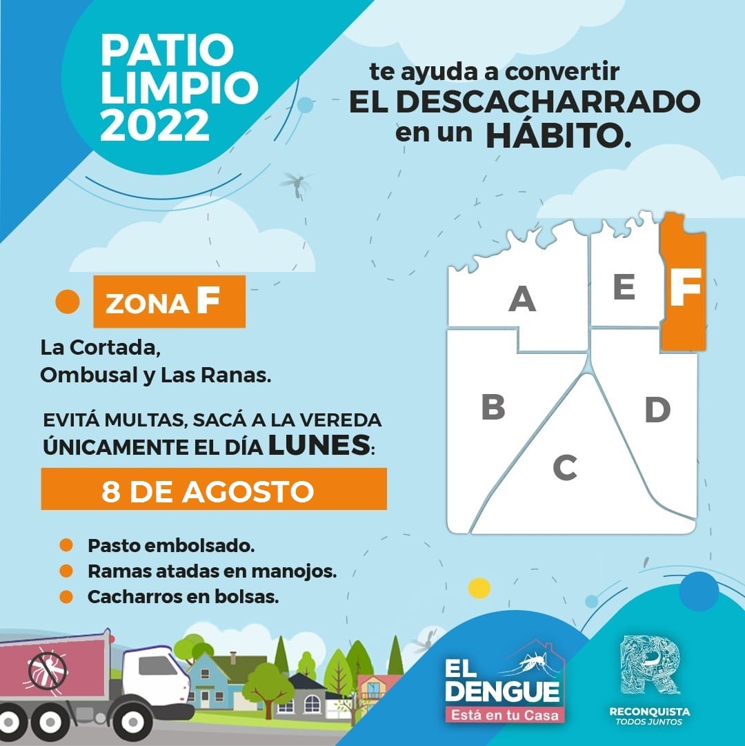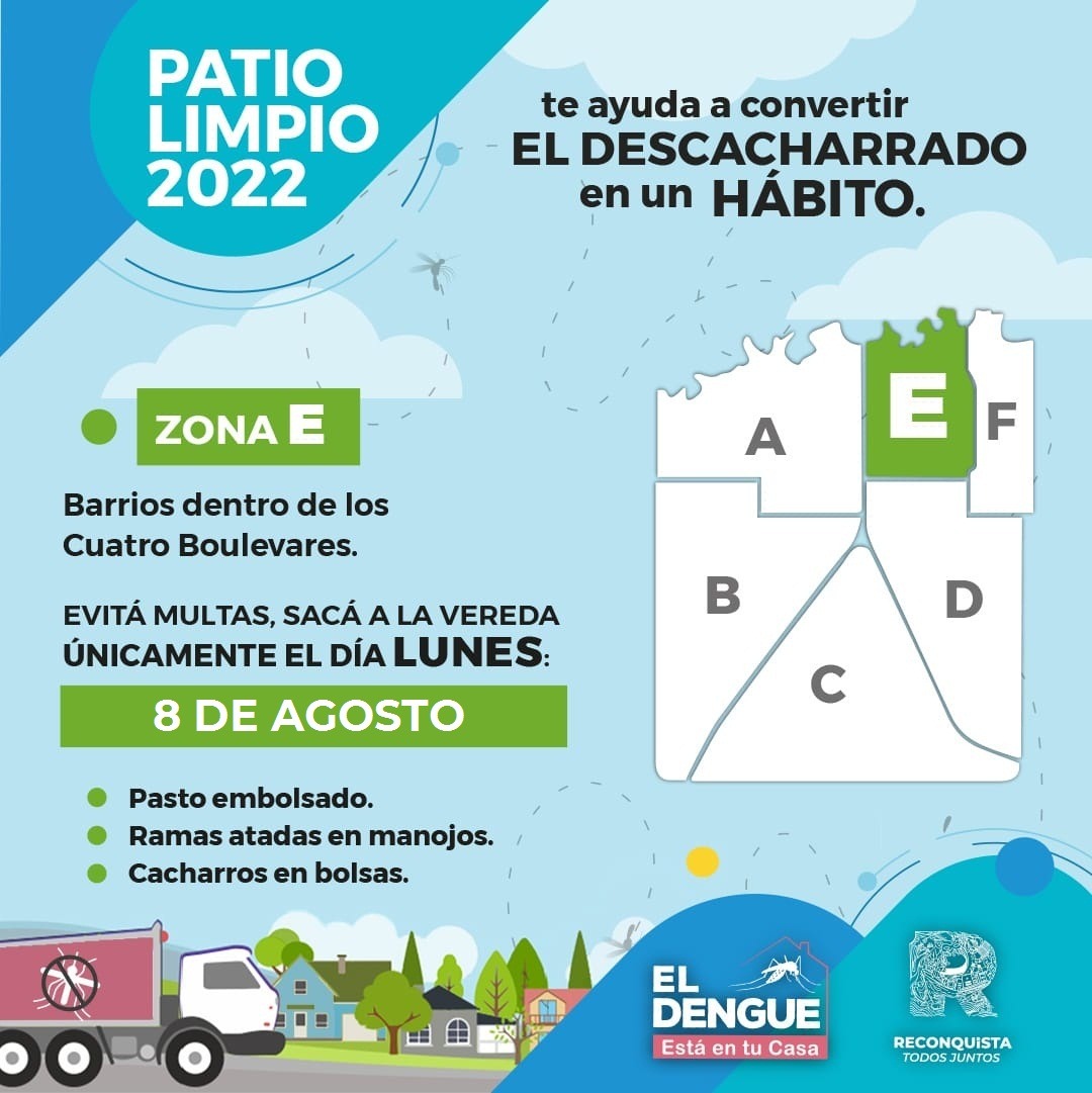 Patio Limpio es un programa impulsado por el Gobierno de nuestra ciudad, el cual propone la recolección de ramas, pastos y cacharros de los domicilios, con el fin de mantener la limpieza de los hogares y luchar contra el Aedes Aegypti, mosquito transmisor del Dengue.