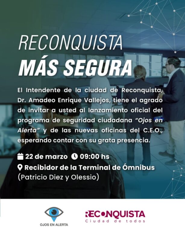 Reconquista: Vallejos presenta el programa de seguridad «Ojos en Alerta» Será este 22 de marzo de 2024 a las 9, en las oficinas de CEO, ingreso a la terminal de colectivos.