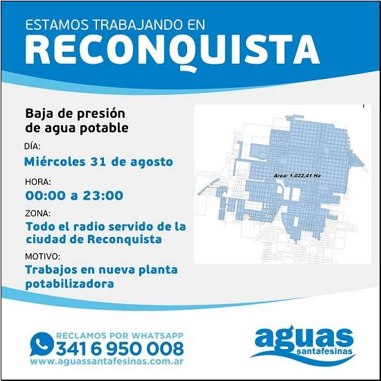 Aguas Santafesinas informa a los usuarios de la ciudad de Reconquista y de las localidades abastecidas por los ramales del acueducto, que el próximo miércoles 31 de agosto de 00:00 a 23:00 horas se verá restringido el servicio de agua potable. De esta manera, se registrará baja de presión del servicio en todo el radio servido de la ciudad de Reconquista, que se continuará brindando con la vieja planta de Bv. Yrigoyen.