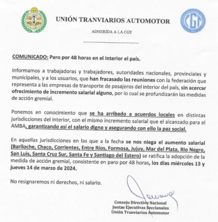Ante los reiterados fracasos en las negociaciones paritarias, la Unión Tranviarios Automotor decretó un paro por 48 horas para todas las líneas del interior del país.