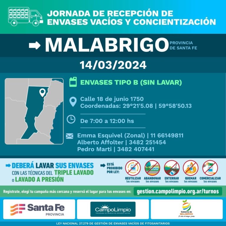 El próximo jueves 14 de marzo, el Gobierno de Malabrigo, la Cooperativa Agropecuaria y Campo Limpio, llevarán a cabo una importante actividad de recepción de envases vacíos de fitosanitarios.
