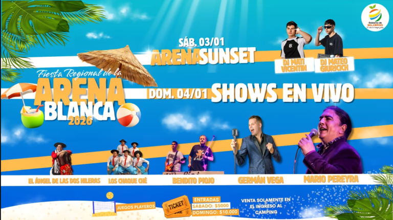 La organización de la Fiesta Regional de la Arena Blanca dio a conocer la cartelera artística de la edición 2026, que se desarrollará los días sábado 3 y domingo 4 de enero en el Camping Municipal “Arenas Blancas”, uno de los escenarios naturales más emblemáticos de la región.