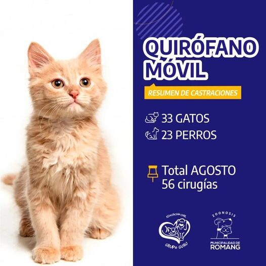 La Municipalidad de Romang informó que el quirófano móvil completó 56 esterilizaciones durante agosto: 33 a gatos y 23 a perros.