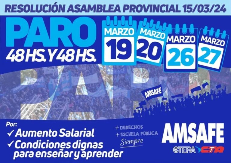 El martes 19 y miércoles 20 de marzo de 2024, se cumplen otras 48 horas de paro a la que convocaron los sindicatos docentes de Amsafé y Sadop, en reclamo de mejoras salariales, acción programada también para los días 26 y 27 de marzo.