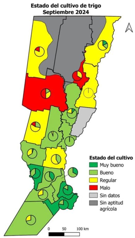 Para ello evaluaron aspectos vinculados al manejo y a la incidencia de factores abióticos y biológicos tales como malezas, plagas y enfermedades. Del análisis de estos datos resulta el mapa de estado general del cultivo por departamento; y dentro de cada uno la proporción de cada nivel de evaluación.